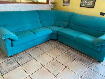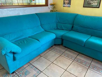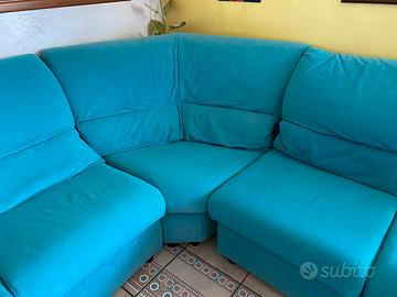 Vendesi Divano in Tessuto Angolare come in Foto, di Colore Azzurro, tenuto molto bene, tutto Sfoderabile e Lavabile, cosi composto: 2 Divani di Larghezza 1,35 cm, con altezza 90 cm; 1 Divano ad Angolo, di 1,35 cm, con Altezza 90 cm; La Seduta è di 50 cm; Prezzo totale: 195,00 Euro.