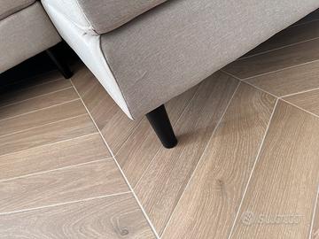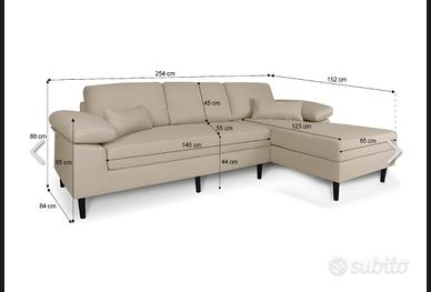 Divano angolare con chaise longue a sinistra, in tessuto beige e piedini neri. Nuovo, acquistato nel mese di Luglio 2024 al costo di 910€. Misure presenti nell'ultima foto.