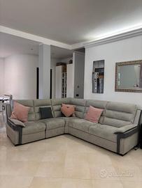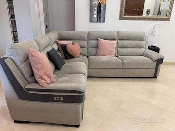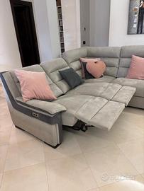 Divano angolare con doppio relax elettico, tessuto microfibra antigraffio.