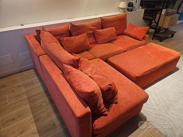 Divano angolare con isola di poltrone e sofà. Buone condizioni, cuscini sfoderabili. Color Aragosta. Dimensioni divano 245 x 200 cm ( penisola inclusa ). Poggiapiedi. Qualche piccola imperfezione causata dal gatto. NO SPEDIZIONE