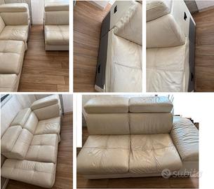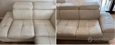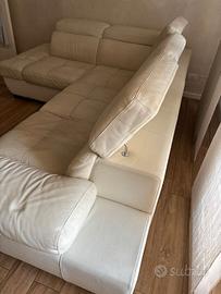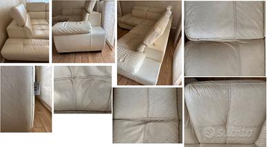Divano angolare 100% Made in Italy in pelle bianca con penisola sinistra, piedi in noce scuro, con 5 poggiatesta regolabili, molto comodo e spazioso. Divano vissuto ma con struttura integra in ottime condizioni, solido e ancora molto confortevole. Presenta alcuni segni di usura sulle cuciture e sui cuscini, visibili nelle foto causati dal normale utilizzo nel tempo. Il primo posto laterale destro è più cedevole rispetto agli altri a causa dell'imbottitura che si è appiattita per l'uso più frequente. Si divide in due parti per agevolare il trasporto. Dimensioni: - Lunghezza lato dx: circa 270 cm - Lunghezza lato sx (penisola): circa 210 cm - Altezza (sulla parte più alta): circa 80 cm Ritiro a mano a carico dell’acquirente Prezzo trattabile