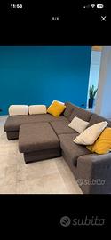 Vendo divano angolare con penisola e pouf coordinato in tessuto grigio.