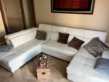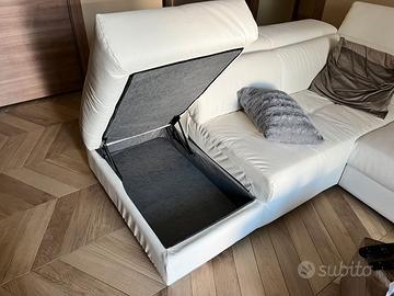Vendo divano angolare Mondoconv – modello LISA, colore bianco, in ecopelle, con penisola destra e pouf contenitore sinistro.