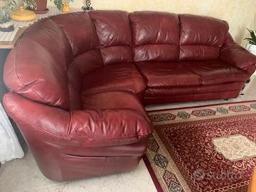 Vendo divano angolare curvo, in pelle Bufalo bordeaux chiaro,ancora in buone condizioni, seduta morbida, lunghezza cm 260 per cm 170, altezza seduta 45 cm, al prezzo di euro 700,00. Ritiro al mio domicilio ad Arcisate a Vostra cura.