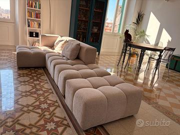 Divano angolare modulare sinistro 4 posti in tessuto strutturato color sabbia, completo di pouf. Modello Lorella CXL by Christian Lacroix. Acquistato a luglio 2025. Ottime condizioni. Presenta due lievi difetti. Dimensioni divano (Alt. 70 cm; Lung. 265 cm; Prof. 145 cm) Dimensioni pouf (Alt. 40 cm; Lung. 85 cm; Prof. 60 cm) Prezzo 1.800 Euro. Spese di imballaggio e spedizione o trasporto a carico dell'acquirente.