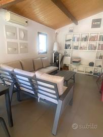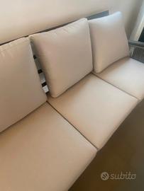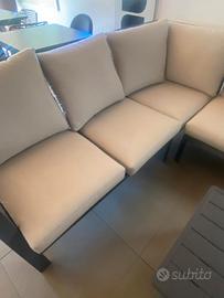 Divano angolare per esterno in alluminio e corda sintetica, dotato di cuscini in acrilico sfoderabili. Misure: m.2,70+ 2,12 di lunghezza angolare, m.0,90 profondità, m.0,87 altezza. Comprensivo di tavolino in alluminio (110x58x44). Marca Vacchetti, nuovo in esposizione, ritiro presso showroom Progetto Esterno, viale della Croce Rossa 115, L'Aquila.