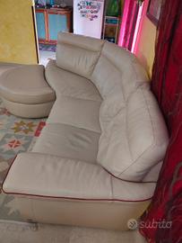 Divano 4 posti angolare curvato in pelle extra fiore colore beige crema in ottimo stato (no bambini no animali) misure lunghezza 255.x 90 altezza, seduta 60cm, meccanismo relax manuale a sx, curva con puff a dx. divisibile per trasporto in 2 pezzi