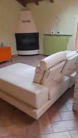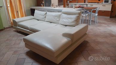 Divano in vera pelle bianco sporco-beige con angolo, piedi in acciaio cromato.