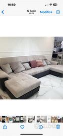 Divano 3,60m x1,70 con doppia penisola contenitore più poggiapiedi estraibile, color grigio perla e grigio in alcatara antimacchia