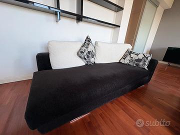 Vendo splendido divano angolare in tessuto nero e bianco panna, con cuscini decorativi a fantasia floreale.