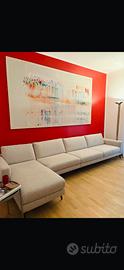 Divano design imbottito angolare Divani&Divani, in tessuto anallergico e anti macchia color neutro (avorio/grigio chiaro mélange) con piedini in alluminio nero. Come nuovo. Stile contemporaneo / minimal. Dimensioni: 3 sedute di larghezza 87 cm ciascuna Chaise longue cm 67 Lunghezza totale: 360 braccioli inclusi Profondità sedute: 70 Profondità sedute schienale e cuscini inclusi: 85 Profondità chaise longue: 135 Profondità chaise longue schienale e cuscino inclusi: 145 Prezzo trattabile