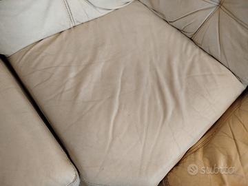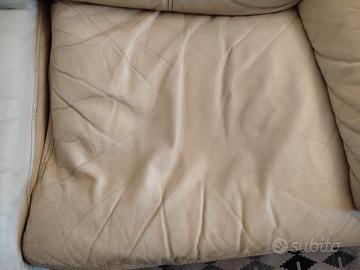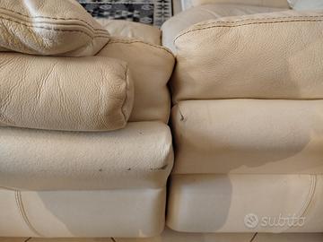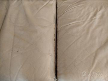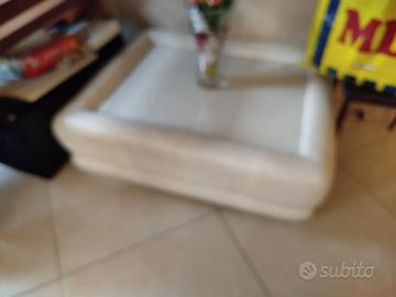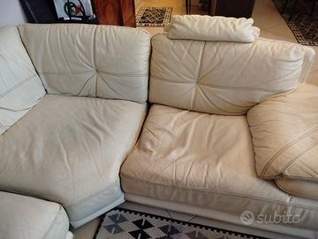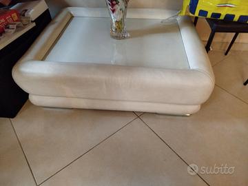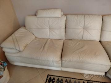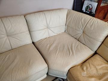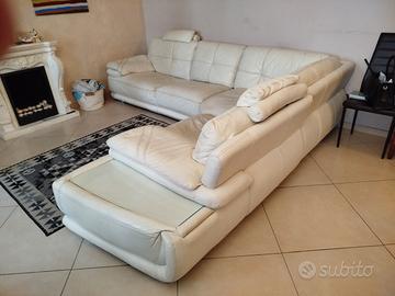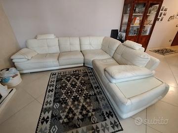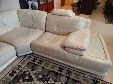 Divano angolare in vera pelle bianca 7 posti misure: (280 x 250) divisibile in 3 pezzi. Abbinato tavolino da appoggio in pelle e vetro.