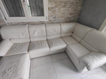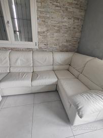 Vendo divano angolare come da foto in pelle bianco panna, lunghezza 290 cm, altezza 90 e profondità max 170. Abbinato pouf 60x60 cm.