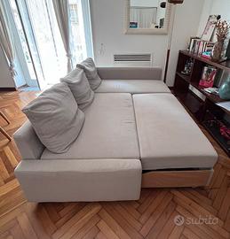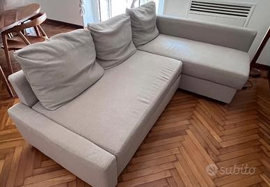Vendo divano angolare con funzione letto, modello IKEA Friheten (o simile), in ottimo stato. Caratteristiche: •Chaise longue con vano contenitore •Si trasforma in letto matrimoniale •Colore beige/grigio chiaro •Dimensioni da seduta: 230x151 cm, h 86 cm Perfetto per soggiorno o monolocale. Visibile a domicilio. Prezzo: 100€ – trattabile Ritiro a carico dell’acquirente.