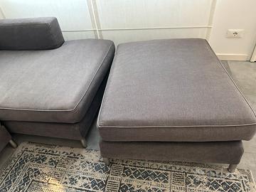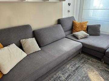 Vendo divano angolare Frigerio (importante marca) in ottime condizioni generali. Rivestimento in tessuto grigio sfoderabile, appoggiatesta regolabile. Composizione ampia ideale per soggiorni grandi: lato principale 3,20 m e chaise longue di 2,40 m, con pouf terminale di 85 cm. Struttura solida e linee moderne, gambe in metallo. Perfetto per chi cerca qualità e praticità in un divano spazioso.