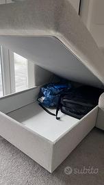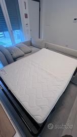 Divano 4 posti in tessuto ciniglia grigio chiaro, con chaise longue a sinistra, letto estraibile con materasso e contenitore. Due anni di vita, completamente sfoderabile e lavabile.