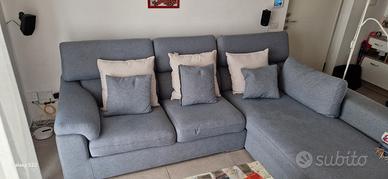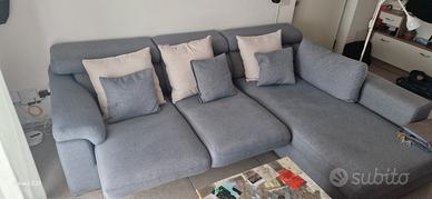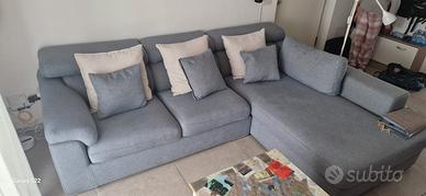 divano angolare grigio, completamente sfoderabile con sedute estraibili e poggiatesta regolabili. ottimo stato, 4 cuscini grigi inclusi