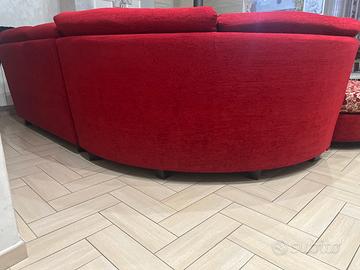 Questo è un magnifico e moderno set di divani, caratterizzato da un design curvo e avvolgente che invita al relax. Il divano principale in un brillante e nuovo tessuto rosso fuoco offre un'estetica audace e contemporanea. L'elemento distintivo è il pratico pouf a mezzaluna, abbinato ma rivestito con un tessuto a fantasia floreale e vivace che introduce un tocco di eleganza e freschezza. L'insieme appare imponente e accogliente, trasformando il soggiorno in uno spazio unico e stilizzato.