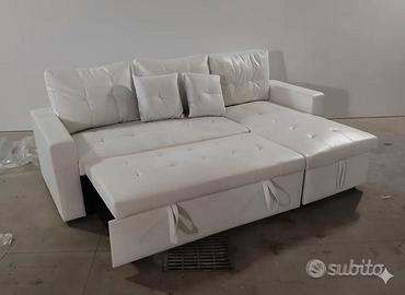 Vendo splendido divano angolare moderno, rivestito in ecopelle bianca, un materiale pratico e di grande impatto visivo. Il divano si trasforma facilmente in un comodo letto, pronto ad accogliere gli ospiti. L'isola offre un ampio spazio relax e nasconde un capiente vano contenitore, ideale per riporre coperte, cuscini o la biancheria da letto, mantenendo la casa ordinata. Dimensioni: larghezza totale 220 cm, profondità isola 140 cm, altro lato 80 cm. Il divano è in ottimo stato generale, ma per la massima trasparenza, si segnala la presenza di alcuni aloni bluastri sulle sedute (visibili in foto).