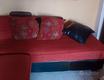Vendo divano angolare stile etnico, divisibile in due, con rivestimento in tessuto rosso e cuscini decorativi sfoderabili, con una base e braccioli in pelle.