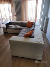 Vendo divano composto da 2 moduli + 1 mobiletto in legno coordinato (usabile come poggiolo o tavolino laterale). I cuscini con imbottitura in penna, rivestimento in tessuto di lino lavabile. Il divano è in buone condizioni generali, si trova al secondo piano senza ascensore.