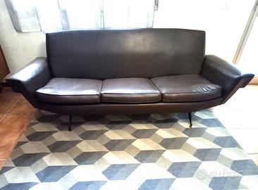 Divano anni 50 in similpelle bruna, sempre tenuto in casa. Dimensioni: 208 lunghezza, 80 altezza. 3 cuscini staccabili. Piedini in ferro e ottone. Struttura solida, segni del tempo. Solo ritiro Rovolo (MO)