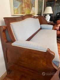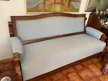 Divano tre posti con legno in ottimo stato, schienale e braccioli ribaltabili. Copertura color celeste.