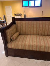 Divano 3 posti con struttura in legno massello, imbottitura seduta e schienale fissa piú due piccoli cuscini a caramella.