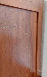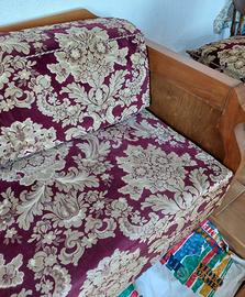 TENUTO BENISSIMO Divano originale antico in legno con braccioli sagomati e lavorati con greche intarsiate, seduta con copertura in velluto damascato, doppio schienale con cuscini in velluto damascato, completo di 2 cassetti inferiori con intarsiature in legno. Smontabile in più elementi Misure: 187 x 80 x 80/88h cm SOLO RITIRO A MANO A TAINO (VA)
