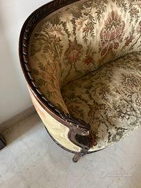Materiali: Presenta una struttura in legno intagliato e un rivestimento in tessuto damascato con motivi floreali.