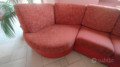 Divano 5 posti con angolo. tondo Stoffa integra, unico segno di usura la perdita di colore dei cuscini della seduta e degli schienali. Misure: 290cm x 140 cm Ritiro a carico dell'acquirente