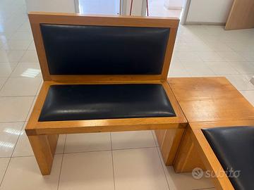 Divano Arredo ideale per utilizzo multiplo (casa, ufficio, locali, sala d'aspetto) composto da 2 moduli; uno con seduta a 4 posti (265 cm) e uno con seduta 2 posti (100cm) completo di tavolino d'angolo (56 cm;) tutto in rovere massello spessore 5 cm con imbotto in ecopelle di alta qualità blu navy. Usato solo per sala d'aspetto studio professionale. Preferibile ritiro in loco o spedizione con maggiorazione prezzo da definire