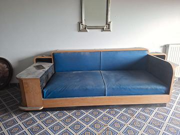 Divano Art Deco vintage Cosy Corner, anni '30/'40. Tipico dell'Art Déco, questo divano integra elementi contenitivi come ripiani a vista e vani nei braccioli. Struttura in legno con seduta rivestita in pelle blu. Misure: larghezza 290 cm; altezza schienale 88 cm; altezza seduta 41 cm; profondità 106 cm