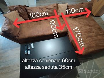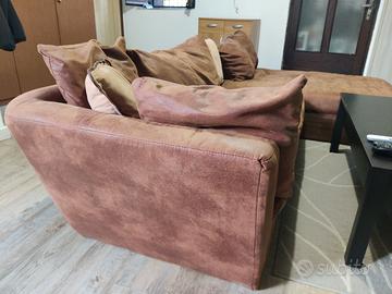 Spettacolare divano artigianale comodo praticamente come nuovo, composto da seduta regolare 2 posti molto larghi e chaise longue anch'essa larghissima. Color tabacco, tessuto microfibra effetto alcantara piacevolissimo al tatto, adatto a chi ha animali per resistenza ai graffi. Corredato da 2 cuscini lunghi dello stesso tessuto, 2 quadrati idem e 2 diversi ma ben assortiti. Vendo per imminente cambio arredo