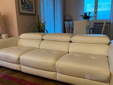 Divano manifattura artigianale, 3 posti in pelle bianca. Funzione relax elettrica su due sedute e due appoggiatesta, appoggiatesta con posizione regolabile manualmente per il posto centrale. Data acquisto: febbraio 2025 Prezzo acquisto: 4800€