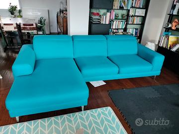 Divano Le comfort tre/quattro posti con chaise longue,azzurro,con piedini. Ottime condizioni,testiera reclinabile in quattro posizioni (vedi foto). Non è sfoderabile ma stoffa molto ben lavabile e antimacchia (abbiamo due bambine e le condizioni sono quelle della foto). Misure nella foto. Si pulisce sotto bene.