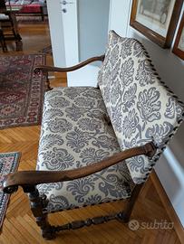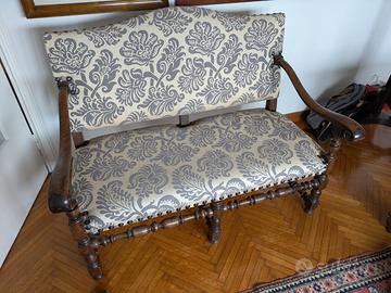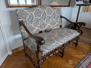 Divano barocco primi decenni del XVIII secolo. In noce, gambe frontali tornite e raccordate tra loro da traverse anch'esse tornite con motivi a rocchetto. Ottimo stato