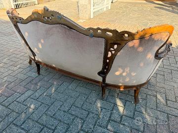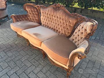 Splendido divano a tre posti in stile Barocco / Luigi XV, caratterizzato da un’importante struttura in legno massiccio interamente intagliata a mano con motivi floreali e riccioli.