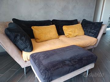 Bellissimo divano 4 posti linea Maestro di poltrone sofa mod. battito d'ali 4 posti in tessuto. Tessuto composè. Rivestimento carezza fugace unito microfibra colore beige scuro. Composizione diritto: 59%poliestere, 27%poliuretanica, 14%cotone. Composizione rovescio: 70%, 30%cotone. Lavabile a secco. Seduta 100% poliestere colore nero. Lombari: lurano inito microfibra colore curcuma. DIMENSIONI 238X102 Pouf grande tessuto composè lavaggio a mano. DIMENSIONI 46X86X50 acquistato nel 2020 per 3mila circa. Il divano è completamente sfoderabile e sostituibile con altre tinte. Cod. rivestimento in caso si volesse cambiare colore, di seguito codici: Riv scocca A1CAR-D01/005 carezza fugace Riv seduta A1LUA-D01/910 LURANO
