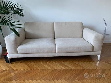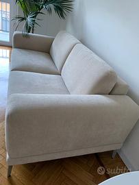 Vendo elegante divano a due posti in tessuto color beige chiaro.