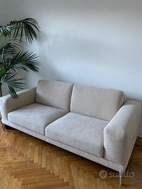 È rivestito in un tessuto color beige chiaro, dall’aspetto morbido e vellutato. I braccioli sono larghi e squadrati, mentre i cuscini della seduta e dello schienale sono spessi e uniformi, offrendo un aspetto accogliente ma ordinato. I cuscini sono sfoderabili e in ottime condizioni, senza macchie né segni evidenti di usura.