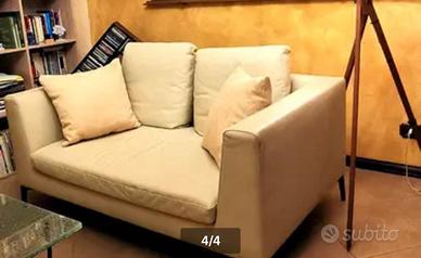 Divano colore crema, perfetto per aggiungere un tocco di stile al tuo salotto. Piedini in metallo per un design moderno. Rivestimento in finta pelle per una sensazione di lusso. Se interessati ne ho un altro uguale, per entrambi tratterò bene.