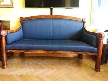 RARISSIMO Divano BIEDERMEIER, in stile DANHAUSER, epoca 1815/1845, originale 100%, sanissimo e molto solido, già maniacalmente restaurato nel totale rispetto del mobile, tapezzeria (raso colore nero) completamente rifatta con cinghie/molle/tessuti, in condizioni da vetrina.