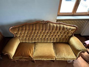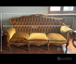 Divano antico in legno con rivestimento in tessuto.