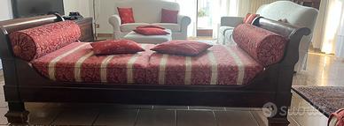 Letto antico trasformato in divano bifronte con doppio utilizzo di divano o letto. In noce, restaurato. Cuscini in perfetto stato. Lunghezza: 210, larghezza 100, altezza 45 cm. Prezzo trattabile.