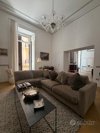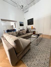 Divano con struttura in legno e derivati con molleggio a cinghie elastiche ed imbottitura in poliuretano espanso, il tutto rivestito in pregiato tessuto color grigio tortora. Cuscini seduta: poliuretano espanso (D30) rivestito in fibre termolegate, ricoperti in tessuto di puro cotone. Cuscini schienale: FILPIUMA (speciale miscela soffice e ipoallergenica di vera piuma e fibra poliestere siliconata cava), ricoperti in tessuto di puro cotone a tenuta di piuma.piedi a vists in wenge’. Dimensioni 287x87x267