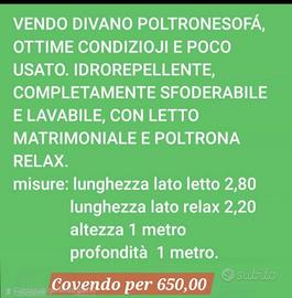 Vendo divano angolare poltrone sofà completamente sfoderabile e lavabile in lavatrice, tessuto idrorepellente, grigio , misure lato letto 2,80 , lato poltrona relax 2,20 . profondità 1 metro , altezza 1 metro . Prezzo 650 euro non trattabili . cell. 3496795230 Michele.