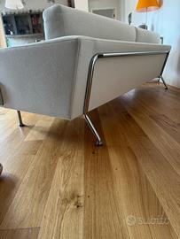 Divano con struttura portante a vista in acciaio cromato o verniciato color alluminio e struttura interna in legno multistrato, progettato per unire robustezza e design contemporaneo. L’imbottitura combina poliuretano espanso privo di CFC e ovatta di poliestere, garantendo comfort e sostegno ottimali. Gli ampi cuscini di seduta e schienale sono completamente amovibili, mentre il rivestimento in tessuto sfoderabile, in una raffinata tonalità tra beige e ghiaccio, permette una facile manutenzione.