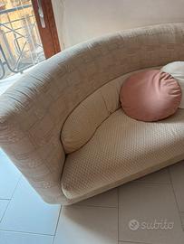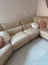 Divano ad angolo color vaniglia formato da moduli 5. Cuscini circolari color rosa e vaniglia abbinati.