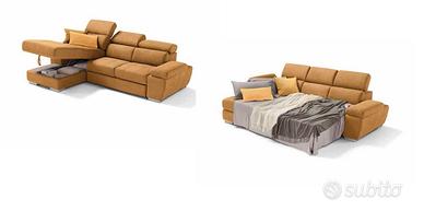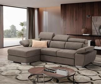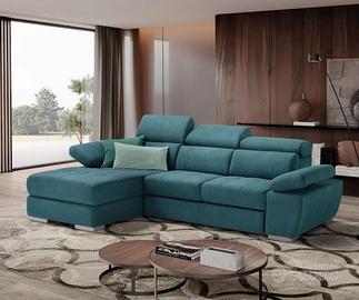 Divano letto angolare con chaise-longue contenitore e panchetta letto a carrello estraibile, poggiatesta reclinabili e braccioli regolabili a cricchetto in base alle proprie esigenze